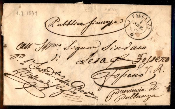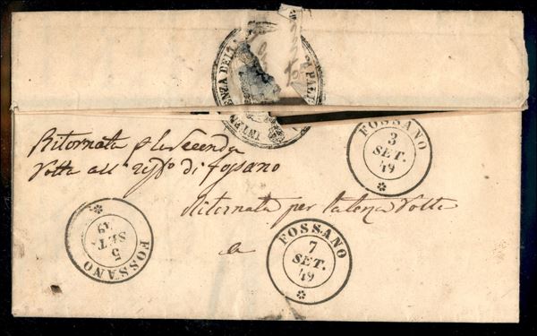 Lettera da PALLANZA 1 SET.49 per Fossano, al verso bollo di arrivo; m/s "Ritornata per la seconda volta all'uff.di Fossano" e "Ritornata per la terza volta" bolli di Fossano del 3, 5 e 7 settembre