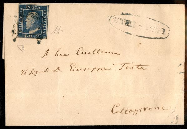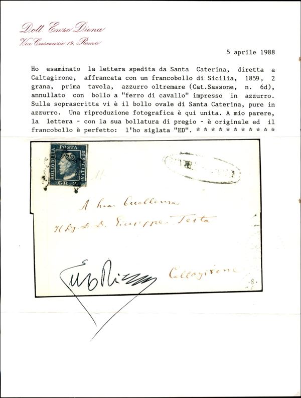 Lettera da Santa Caterina (ovale azzurro p.ti 10) a Caltagirone con gr.2 azzurro oltremare prima tavola, cert. E.Diena
