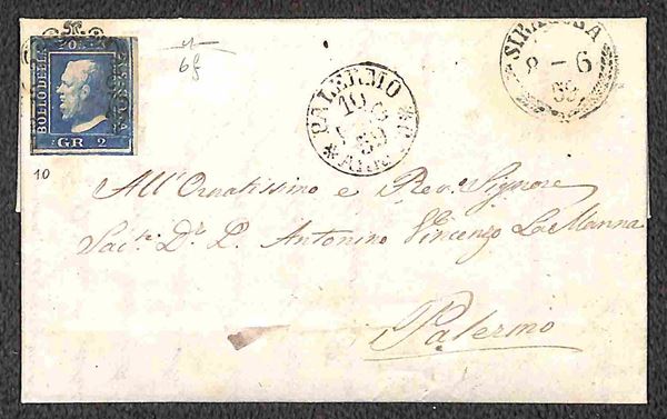 Lettera da Siracusa a Palermo 10 maggio 1859 affrancata con 2 gr. azzurro vivo I tav. bordo di foglio a destra (Sass. 6f) annullato con ferro di cavallo e a lato il cerchio con palme in colore verde nerastro (p. 12) rara cert. Manzoni