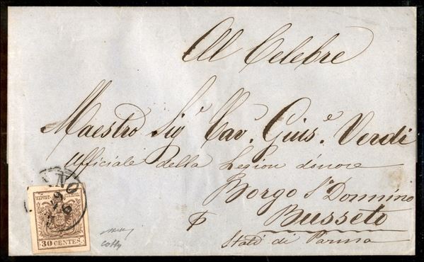 Lettera dal Lombardo Veneto con c.30 in tariffa di primo porto per la seconda distanza, diretta a Borgo S.Donnino per Bussetto ed indirizzata al maestro Giuseppe Verdi, cert. Bolaffi