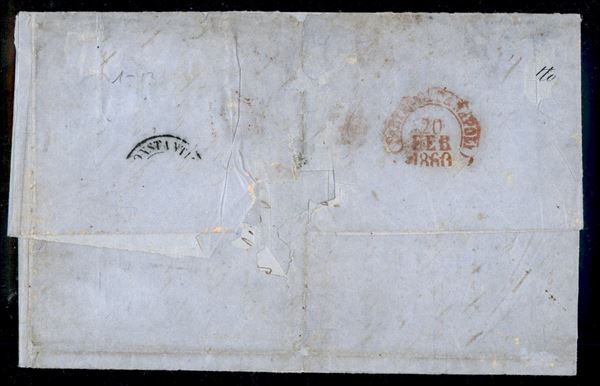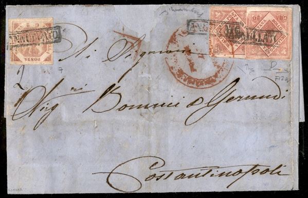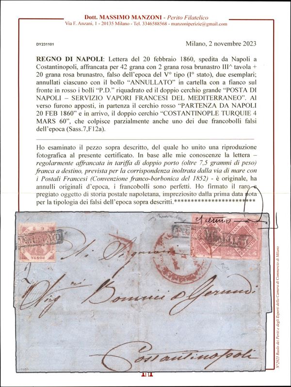 Lettera del 20 febbraio 1860 da Napoli a Costantinopoli affrancata per 42 grana con 2 gr. rosa brunastro III tav. + 20 gr. Falso V tipo (I stato) rosa brunastro (Sass. 7, F12a) PRIMA DATA NOTA di questo raro falso senza ritocco - cert. Manzoni