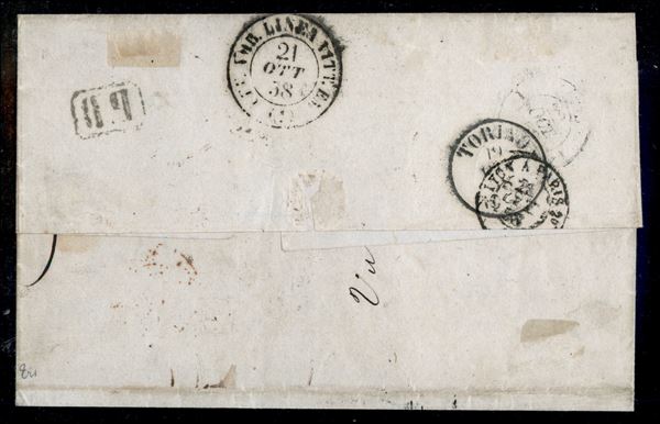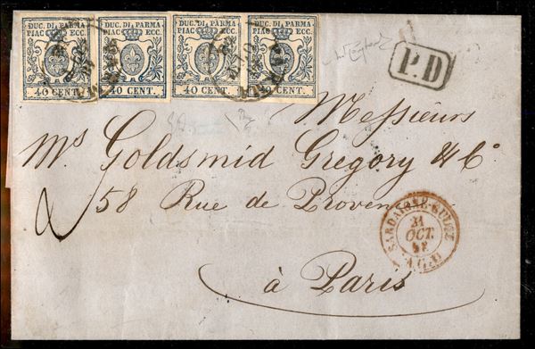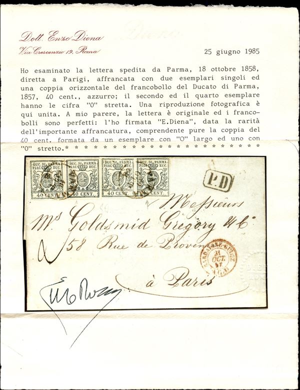 Lettera di doppio porto da Parma a Parigi il 18 ottobre 1858 affrancata per 160 cent. con una coppia del 40 III em. zero stretto e zero largo + due singoli esemplari del 40 III zero stretto e zero largo. Molto rara e qualità eccezionale (Sass. 11 e 11b) cert. Diena e Raybaudi