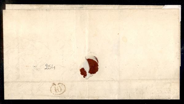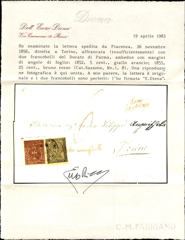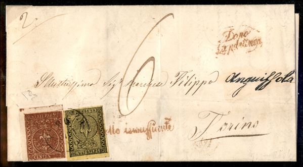 Lettera doppio porto con c.5 giallo prima emissione + c.25 bruno rosso seconda emissione, angolo di foglio da PIACENZA 26 NOV.1856 per Torino, con i bolli in rosso DOPO LA PARTENZA e "Bollo insufficiente", tassata 6 decimi in arrivo a Torino, cert. E.Diena - rara
