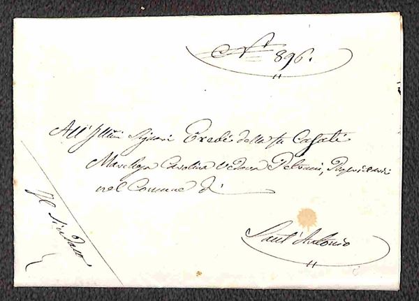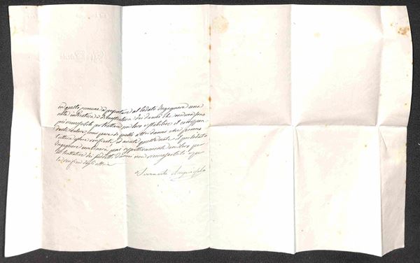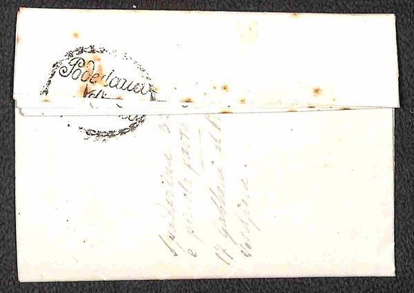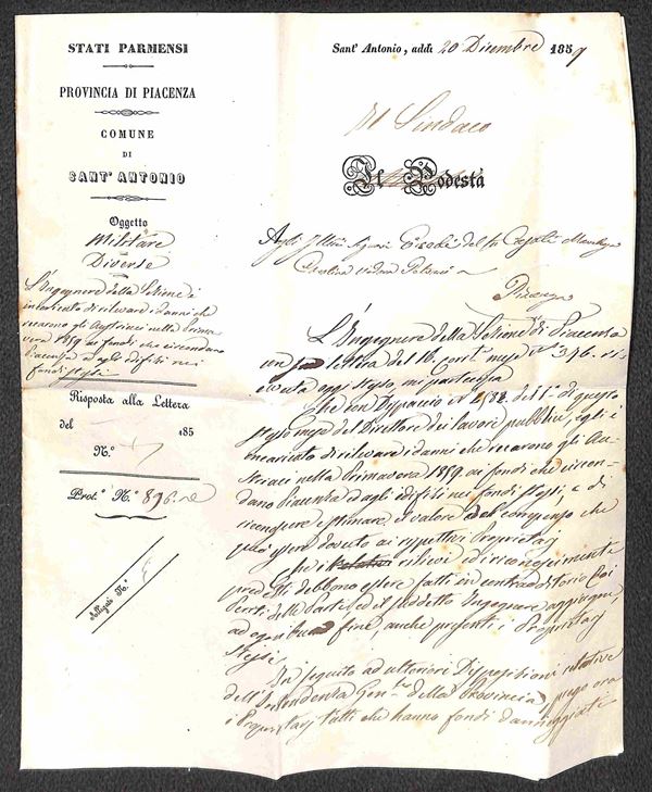 Lettera in franchigia dal sindaco di Sant'Antonio di Piacenza ad una famiglia locale, con la richiesta di quantificare i danni subiti durante la Seconda Guerra d'Indipendenza. Dal testo "..incaricato di rilevare i danni che recarono gli Austriaci nella primavera del 1859 ai fondi che circondano Piacenza ed agli edifici dei fondi stessi, e di riconoscere e stimare il valore del compenso che puņ essere dovuto ai rispettivi Proprietari".