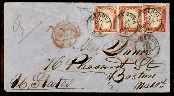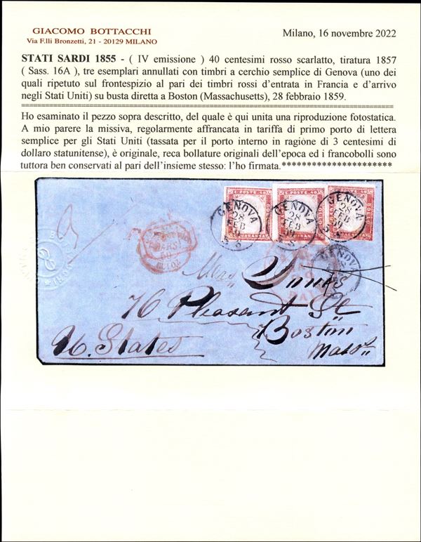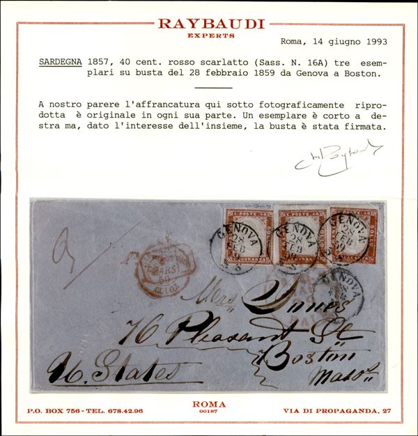 Lettera per gli Stati Uniti con tre esemplari c.40 rosso scarlatto da GENOVA 28 FEB.59 per Boston. Cert. G.Bottacchi, Raybaudi