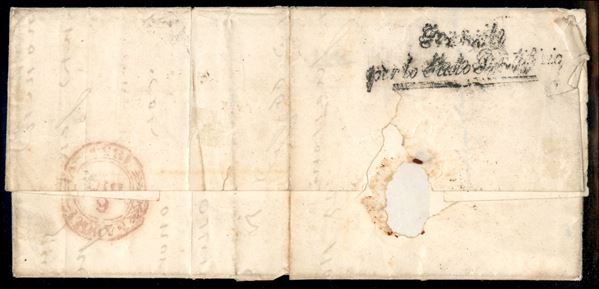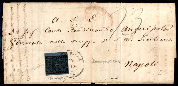 Lettera per il Regno di Napoli in transito per lo Stato Pontificio con c.40 azzurro, bordo di foglio, da PARMA 27 MAR 1854 tassata in arrivo per 23 grana (tassa per 2 fogli), cert. G.Bolaffi