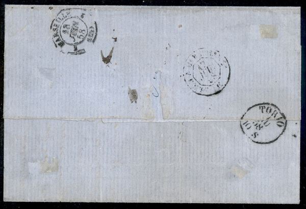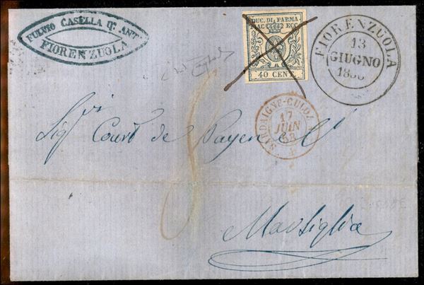 Lettera per la Francia con c.40 azzurro terza emissione, annullato a penna da FIORENZUOLA 13 GIUGNO 1853 per Marsiglia, con segno di tassa 8 decimi per l'affrancatura insufficiente, cert. Raybaudi,rara