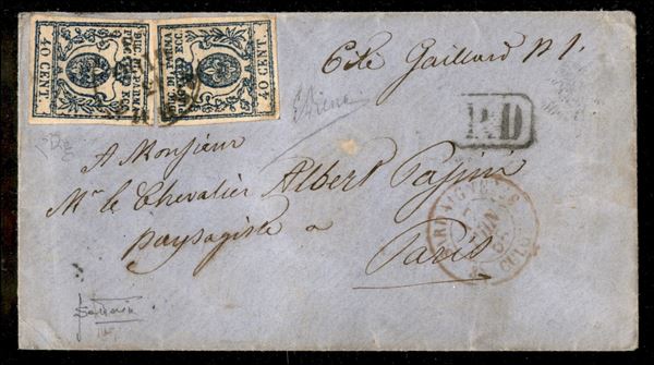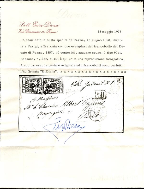 Lettera per la Francia con due esemplari c.40 azzurro terza emissione da PARMA 13 GIUG.58 per Parigi con bollo PD in cartella e bollo dell'ufficio di scambio di Culoz, cert. E.Diena