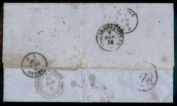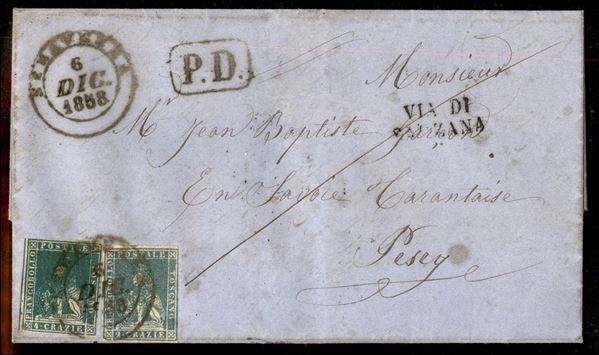 Lettera per la Savoia da SERRAVEZZA 6 DIC.1858 a Pesey, frazione di Aime, affrancata con cr.2 azzurro + cr.4 verde (13 + 14 cat.2500), a lato il bollo in cartella PD e il lineare su due righe VIA DI SARZANA