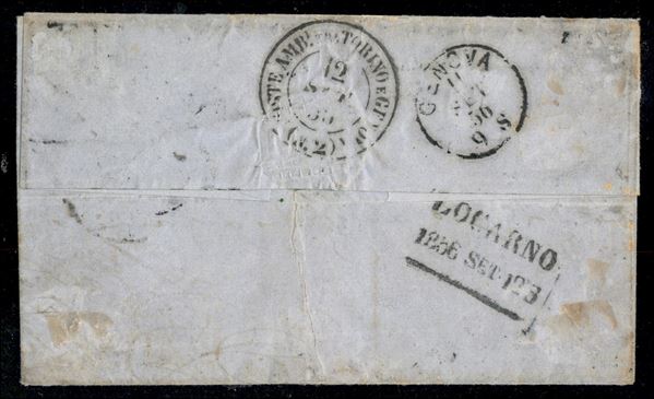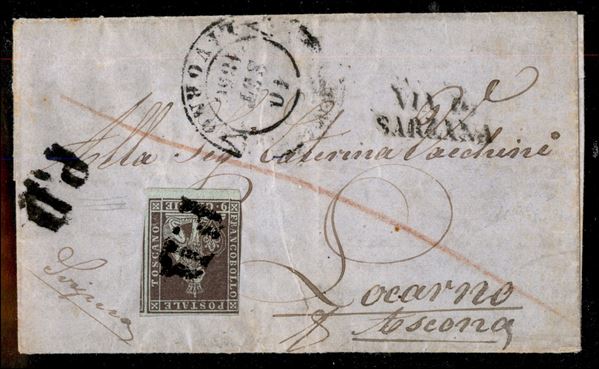 Lettera per la Svizzera affrancata con cr.9 bruno violaceo su grigio annullato con bollo P.D. da LIVORNO 10 SET.1856 per Ascona con bollo VIA DI SARZANA, francobollo con tre grandi margini ma intaccato a destra in alto