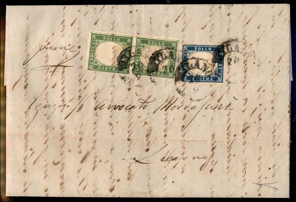 Lettera per la Svizzera affrancata con Sardegna coppia verticale c.5 verde giallo + c.20 azzurro scuro (13Ba+15B) da MILANO 20/9 del 1859 per Magadino, cert. Bottacchi, rara