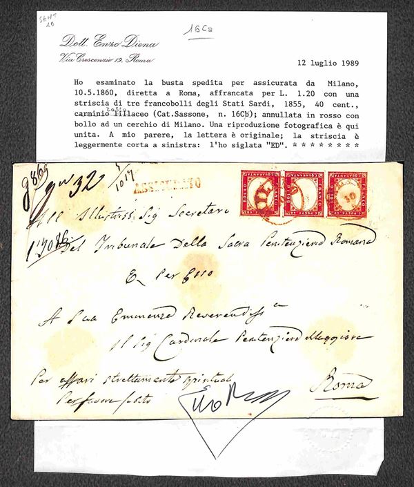Lettera raccomandata di quarto porto diretta a Roma, franca a destino, affrancata con Sardegna c.40 rosso carminio (16Ca) con annulli rossi di MILANO 10/5 del 1860, firma Bottacchi e cert. E.Diena