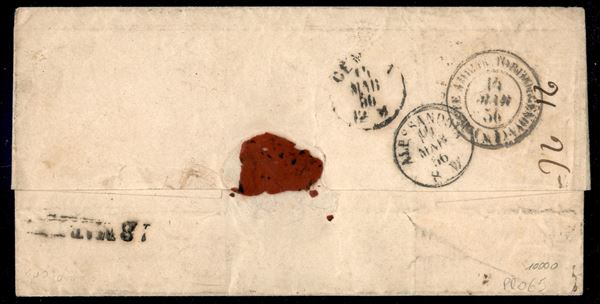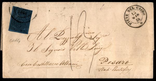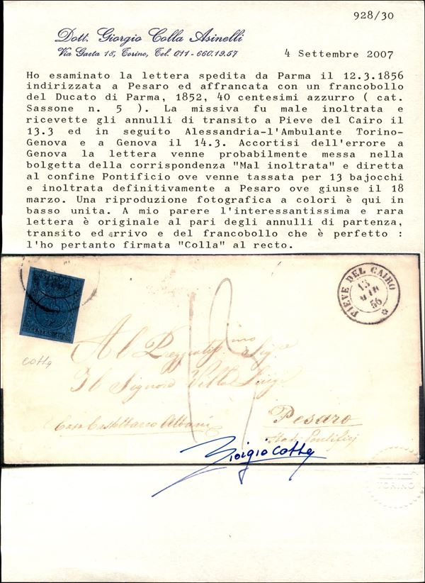 Lettera spedita da PARMA 12 MARZO 1856 per Pesaro e affrancata con c.40 azzurro, erroneamente instradata con annulli di transito di PIEVE DEL CAIRO 13 MAR.56 sul fronte e al verso i bolli di Alessandria, Ambulante Torino-Genova e Genova del giorno successivo, tassa in arrivo nello Stato Pontificio per 13 baiocchi, bollo di arrivo del 18 marzo, cert. G. Colla