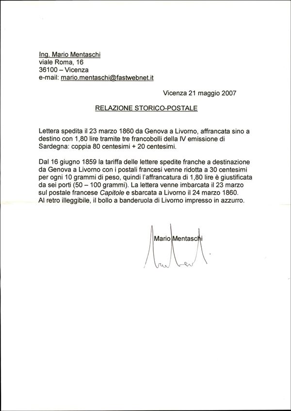 Lettera via di Mare coi postali Francesi da GENOVA 23 MAR.60 per Livorno in tariffa da sei porti affrancata con c.20 azzurro + coppia c.80 giallo limone, molto rara, relazione storico postale M.Mentaschi