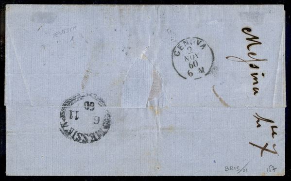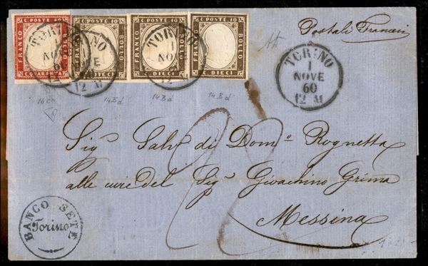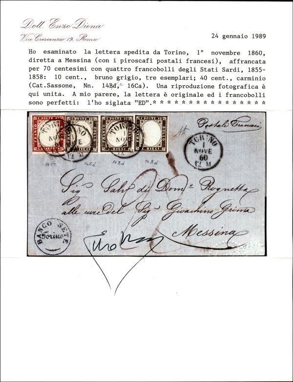 Lettera via di Mare coi postali Francesi da TORINO 1 NOV.60 per Messina affrancata con tre esemplari c.10 bruno grigio + c.40 carminio (14Be + 16Ca) con tassa 22 grana allo sbarco, cer. E.Diena