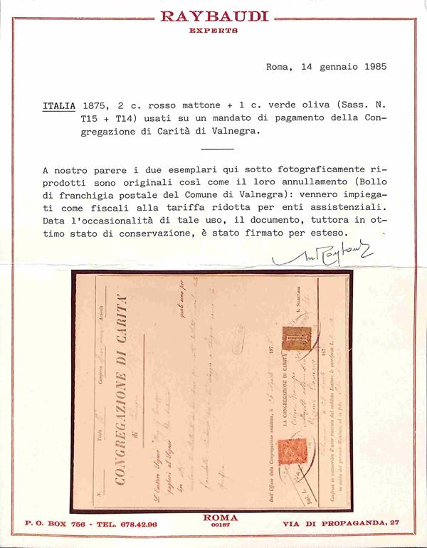 Mandato di pagamento della congregazione di caritą di Valnegra (BG) per rimborso spese con uso fiscale di 2 pił 1 cent (14 + 15) alla tariffa ridotta per enti assistenziali - raro - Valnegra 26.8.75 - cert. Raybaudi