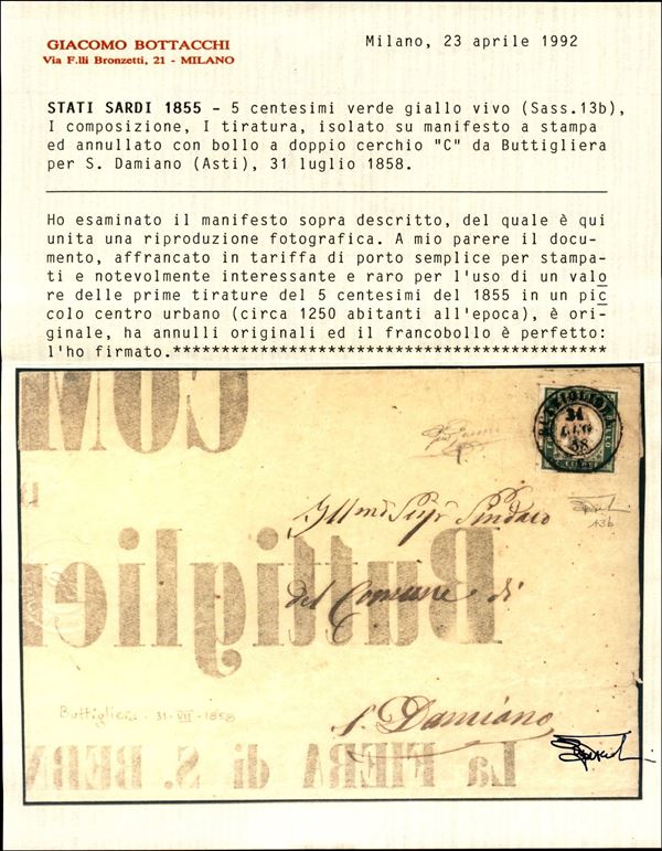 Manifesto affrancato con c.5 verde giallo vivo (13b) da BUTTIGLIERA 31 LUG.58 per S.Daminano, uso molto tardo caratteristico di località a basso tasso abitativo, cert.G.Bottacchi