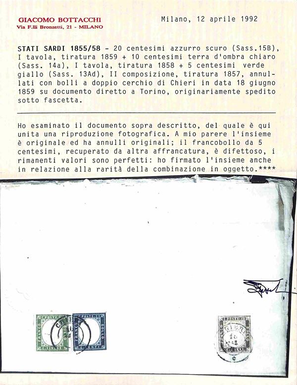 Manoscritti sotto fascia in affrancatura tricolore con c.5 verde giallo + c.10 terra d'ombra + c.20 azzurro da CHIERI 16 GIU.59, tariffa molto rara