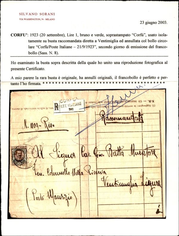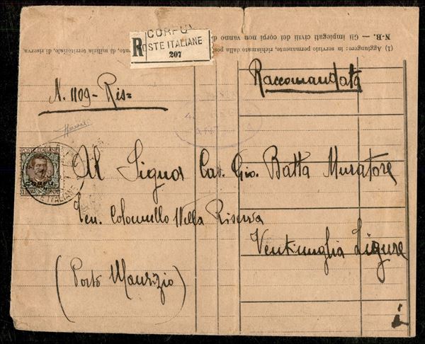 Raccomandata con L.1 bruno e verde soprastampato "Corfu" diretta a Ventimiglia, secondo giorno d'emissione, validità postale di soli sette giorni, rarissimo il valore da 1 lira isolata