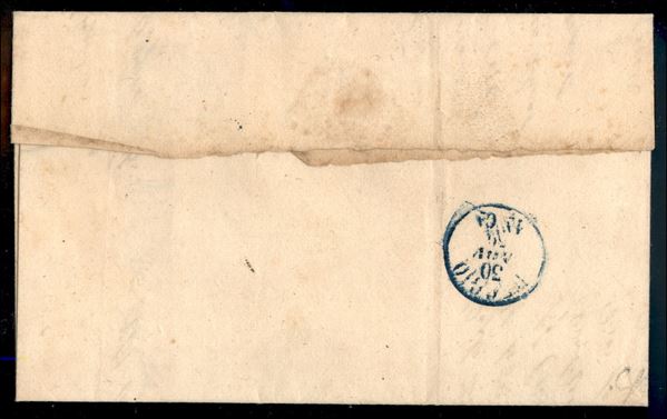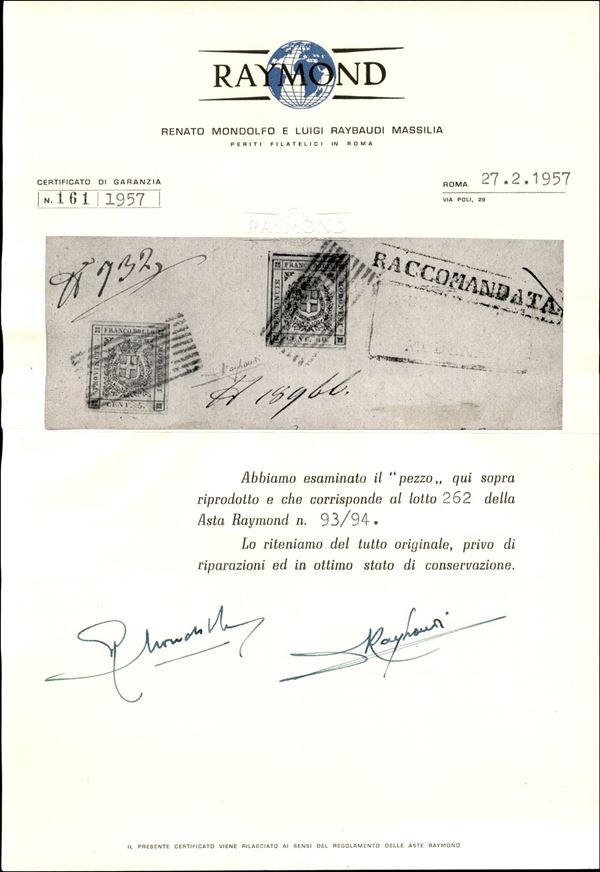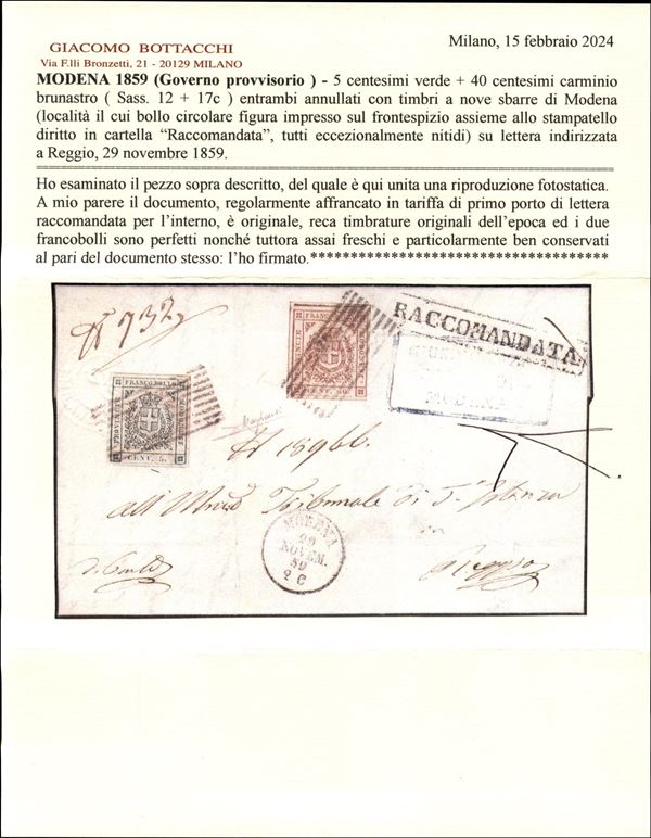 Raccomandata da Modena a Reggio affrancata con 1 es. 5 cent. verde + 40 cent. carminio - SPLENDIDA e rara perché senza cancellature e bolli eccezionalmente nitidi - cert. Bottacchi (Sass. 12+17c)