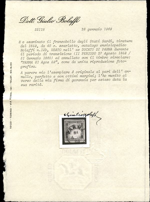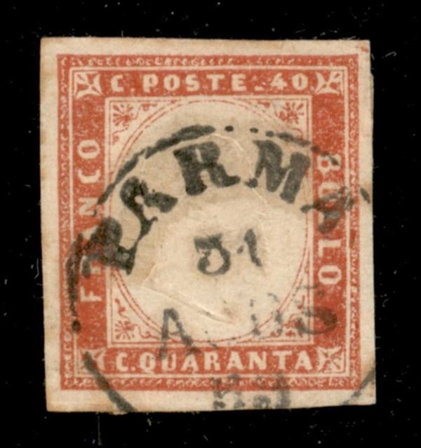 Sardegna c.40 rosso carminato annullato PARMA 31 AGOS.59, primi giorni del secondo periodo d'uso, cert. G. Bolaffi