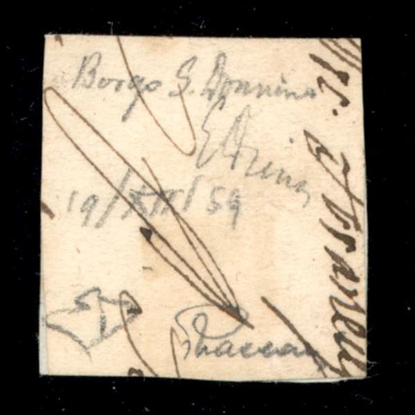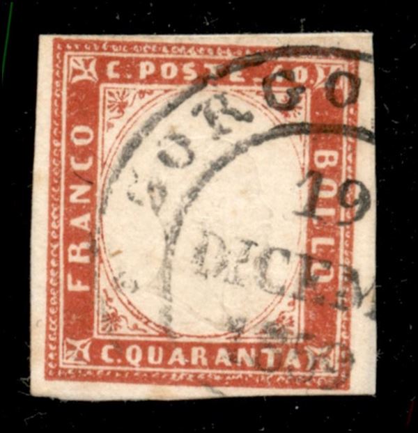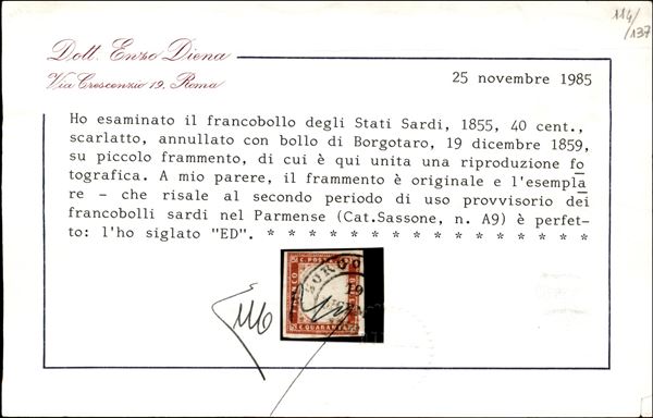 Sardegna c.40 rosso scarlatto annullato BORGOTARO 19 DICEMB.59, secondo periodo d'uso, estremamente raro l'annullo di Borgotaro su 40 centesimi, forse unico, cert. E. Diena