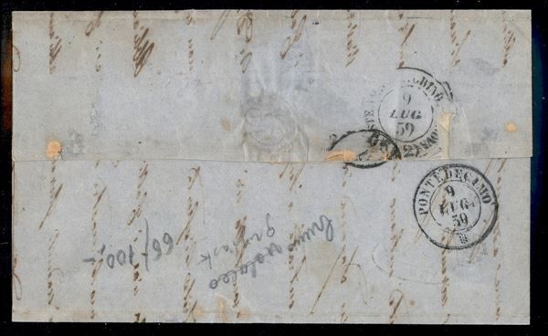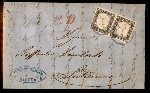 Sardegna coppia c.10 bruno annullati a MILANO 7/7 del 1859, tariffa interna ma ancora con bollo P.D. in rosso, primo periodo del Governo Provvisorio