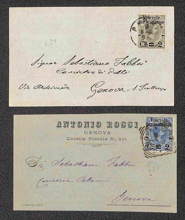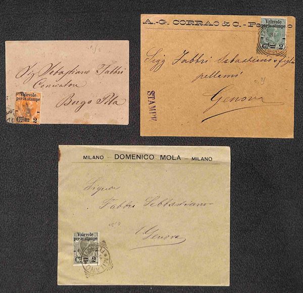 Soprastampati Valevole per le stampe c.2, lotto di due cartoline e tre buste affrancate con valori isolati (50, 51, 53 e 54 cat.400) di qualità molto bella