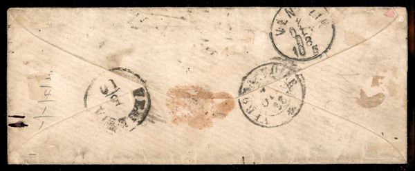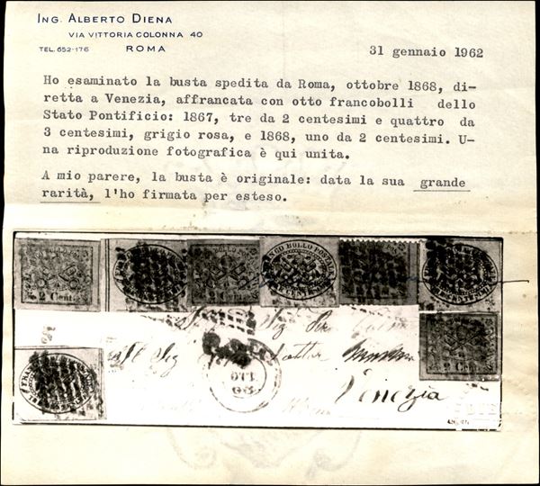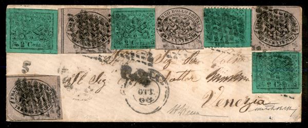 Splendida bustina affrancata con valori della II e III emissione dello Stato Pontificio - 3 esemplari del 2 cent verde giallastro scuro (17) + un 2 cent verde giallastro dentellato (25) + 4 esemplari del 3 cent grigio rosa (18) da Roma a Venezia del 3 ottobre 1868 - grande rarità qualità Bolaffi ad Honorem - cert. A. Diena + cert. Bolaffi