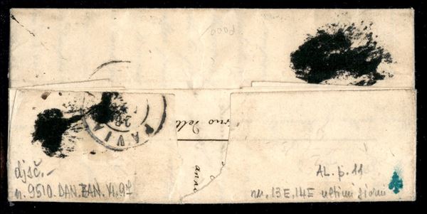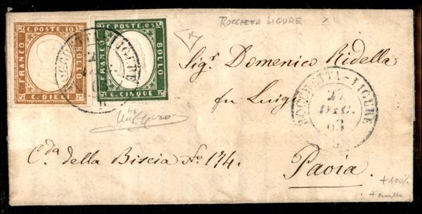 Splendida letterina affrancata con 5 cent + 10 cent (13Ea + 14E) da Rocchetta Ligure (azzurro - P.ti 11) a Pavia del 27.12.43 - raro insieme molto bello - ex coll. Provera - cert. Diena
