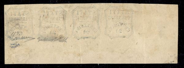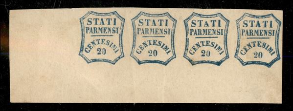 Striscia di quattro c.20 azzurro, angolo di foglio inferiore sinistro, firma per esteso A.Diena e G.Bolaffi