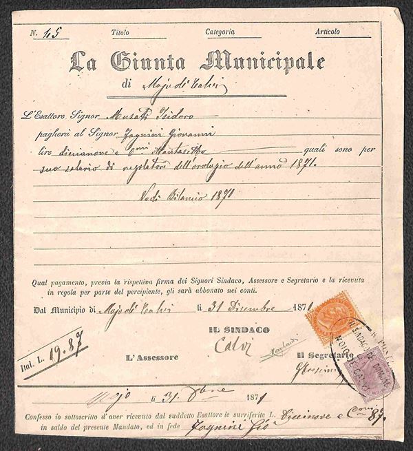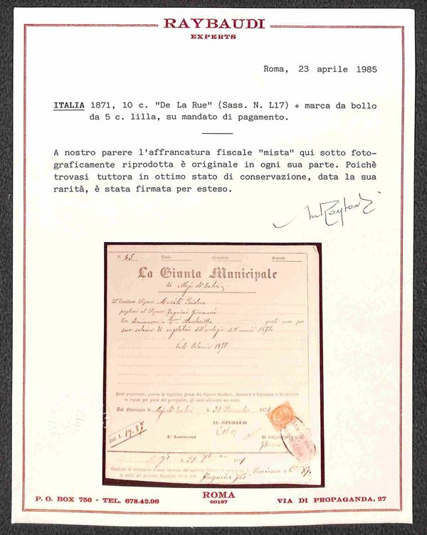 Tassa assolta per 10 cent (L17) + Marca da Bollo 5 cent (6) su mandato di pagamento da Moio de Calvi del 31.12.71 - combinazione molto bella - cert. Raybaudi