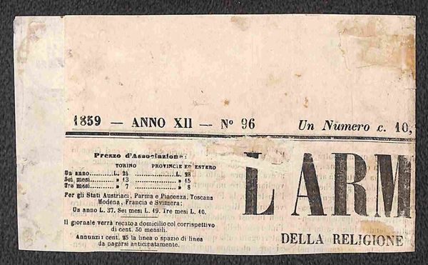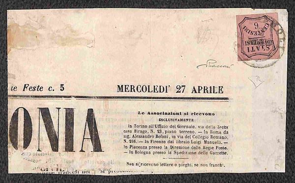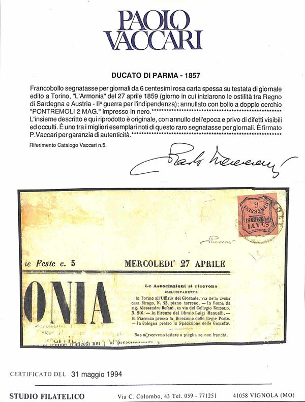 Testata di Giornale L'ARMONIA affrancato con segnatasse c.6 rosa annullo PONTREMOLI 2 MAGGIO 1859, unico caso in Governo Provvisorio del I periodo, cert. Vaccari e E. Diena, rarità eccezionale