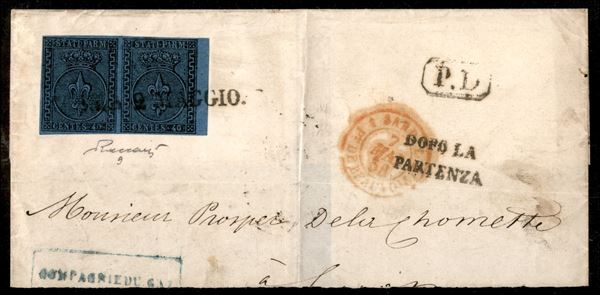 Testata di lettera con coppia c.40 azzurro, bordo di foglio, da PARMA 2 MAGGIO del 1856 con a lato i bolli P.D in cartella e lineare su du righe DOPO LA PARTENZA