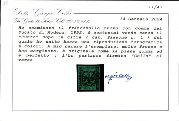 1852 - c.5 senza punto dopo le cifre (1) nuovo con piena gomma e ben marginato, cert.Colla