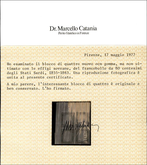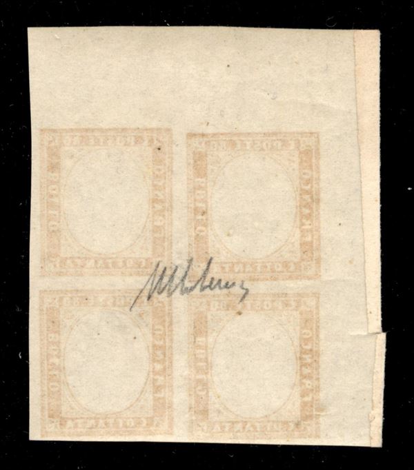 1862 - Blocco di quattro esemplari c.80 arancio carico angolo di foglio in alto a sinistra con gomma integra, non ultimato in quanto privo di effigie, firma M.Catania