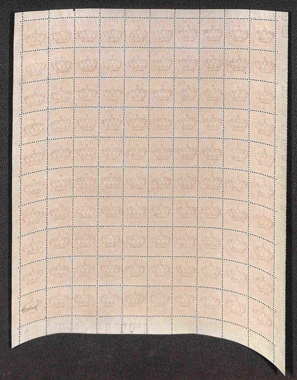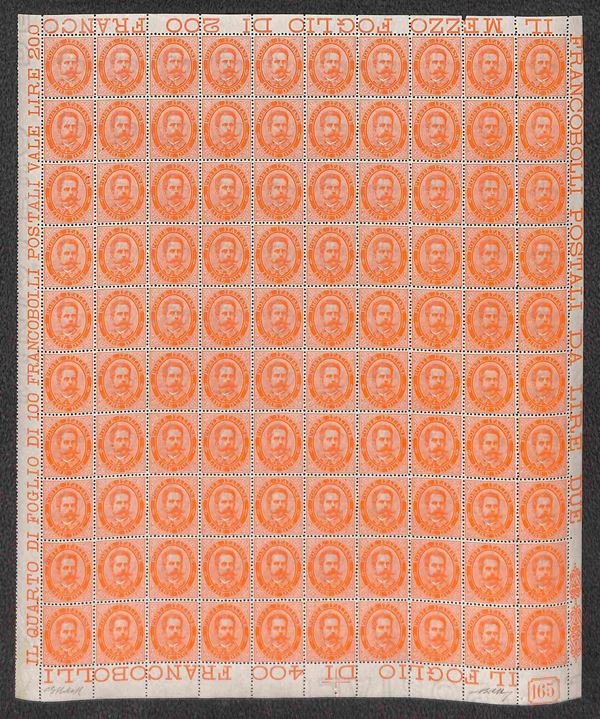 1879 - Splendido foglio intero di 100 esemplari del 2 lire Umberto (43) - bellissima qualità con centrature da discrete a ottime - numero di tavola in basso a destra "165" - oggetto di grande qualità - Bolaffio