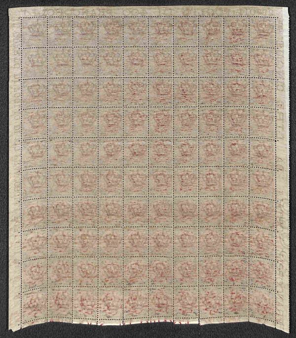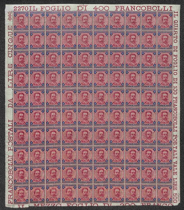 1891 - Splendido foglio di 100 esemplari del 5 lire Umberto (64) - gomma integra e bordi completi - bellissimo - cert. Finanziario Bolaffi 100%