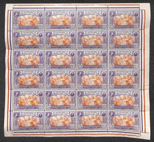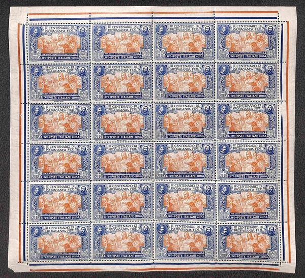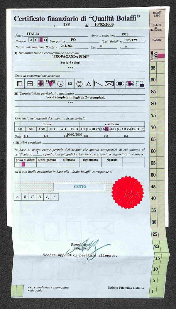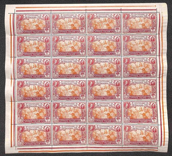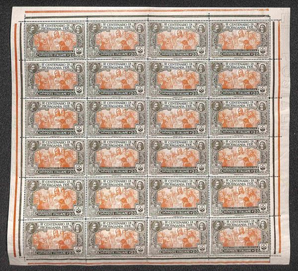 1923 - Splendida serie completa in fogli di 24 esemplari della Propaganda Fide (131/134) - gomma integra e bordi completi - molto bella - cert. Finanziario Bolaffi 100%