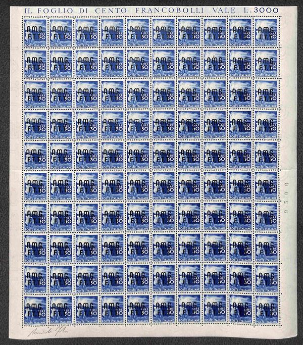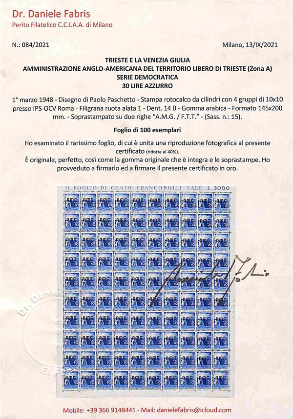 1948 - Splendido foglio di 100 esemplari del 30 lire Democratica (15) - gomma integra e bordi completi - molto raro - cert. oro Fabris