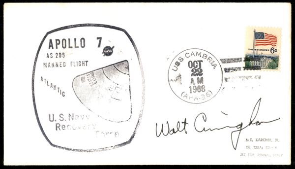 1968 - Apollo 7 - busta commemorativa della missione Apollo 7 con annullo della nave di recupero il giorno dell'atterraggio "USS Cambria 22 Oct 1968" con firma autografa di Walter Cunningham, membro insieme a Walter Schirra e Donn Eisele dell'equipaggio che effettuò 163 orbite complete intorno alla terra – molto bella