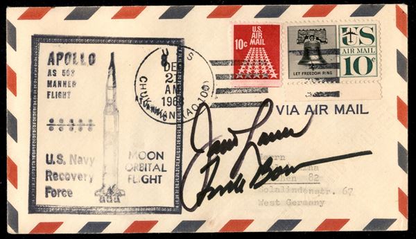 1968 - Apollo 8 - busta commemorativa della seconda missione Apollo con equipaggio umano e che per la prima volta entra nell'orbita lunare - annullo 21.12.1968, giorno del lancio e timbro della nave secondaria di recupero USS Chukawan - firme autografe di J.Lovell e F.Bormann, membri insieme a W.Anders del primo volo circumlunare – ottima qualità