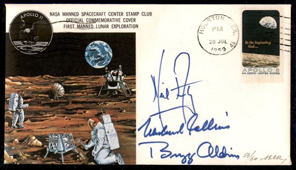 1969 - Insurance cover - busta affrancata con francobollo "Apollo 8" timbrata il giorno di partenza dell'Apollo XI con firme autografe degli astronauti N. Amstrong M. Collins e E. Aldrin - molto bella e non comune - numerata 7 su 35 - cert. finanziario Bolaffi 100%