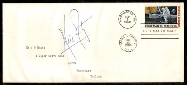 1971 - Busta annullata Moon Landing 20.7.69 e Washington DC 9.9.69 con firma autografa dell'astronauta N. Amstrong apposta in occasione della visita presso il Royal Aircraft Establishment del 22.6.71 - una delle due buste conosciute come da copia del documento allegato - molto bella e rara