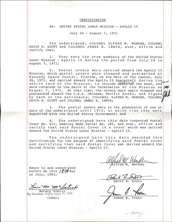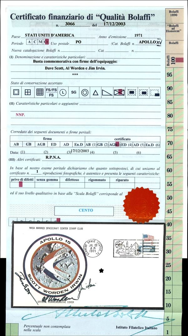 1971 - Busta commemorativa Apollo XV con firme autografe degli astronauti D. Scott A. Worden e J. Irvin annullata Kennedy Space Center 26.7.71 - molto bella - cert. finanziario Bolaffi 100%