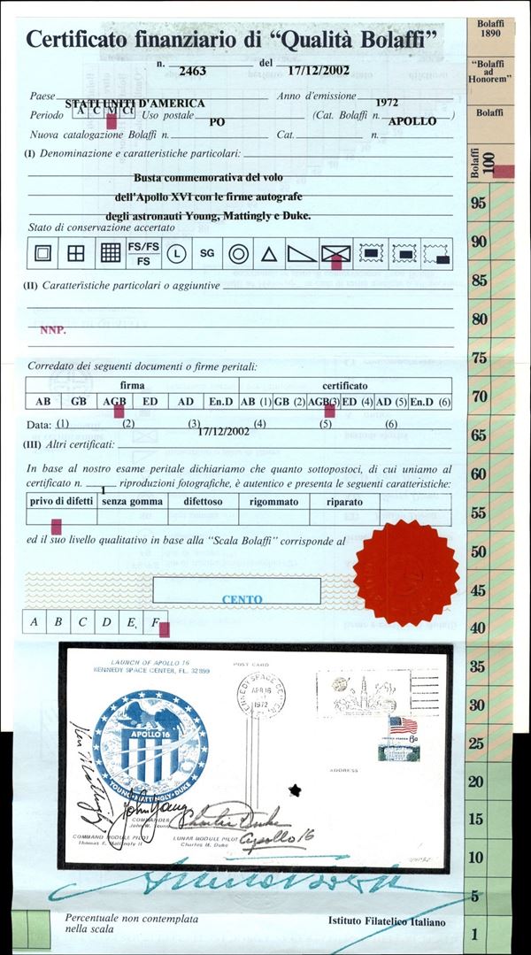 1972 - Apollo 16 - cartolina commemorativa annullata Kennedy Space Center Fl. 16.4.72 e con firme autografe degli astronauti Young Mattingly e Duke - cert. finanziario Bolaffi 100%