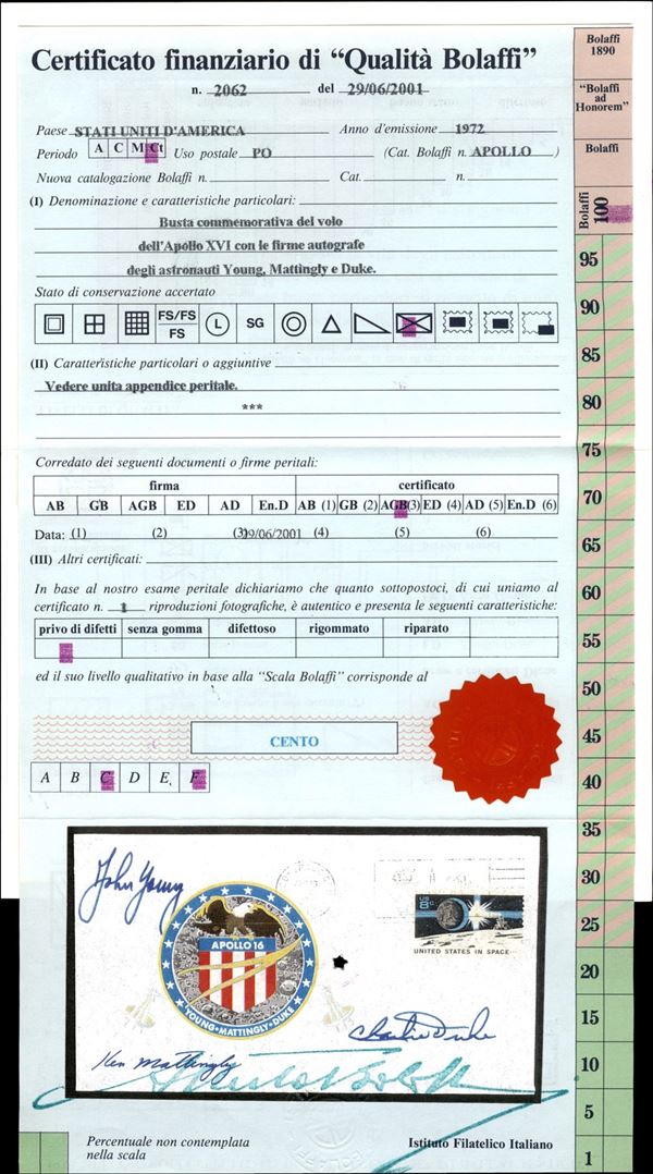 1972 - Insurance cover - busta commemorativa Apollo XVI con firme autografe degli astronauti J. Young K. Mattingly e C. Duke - molto bella - cert. finanziario Bolaffi 100%