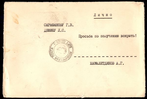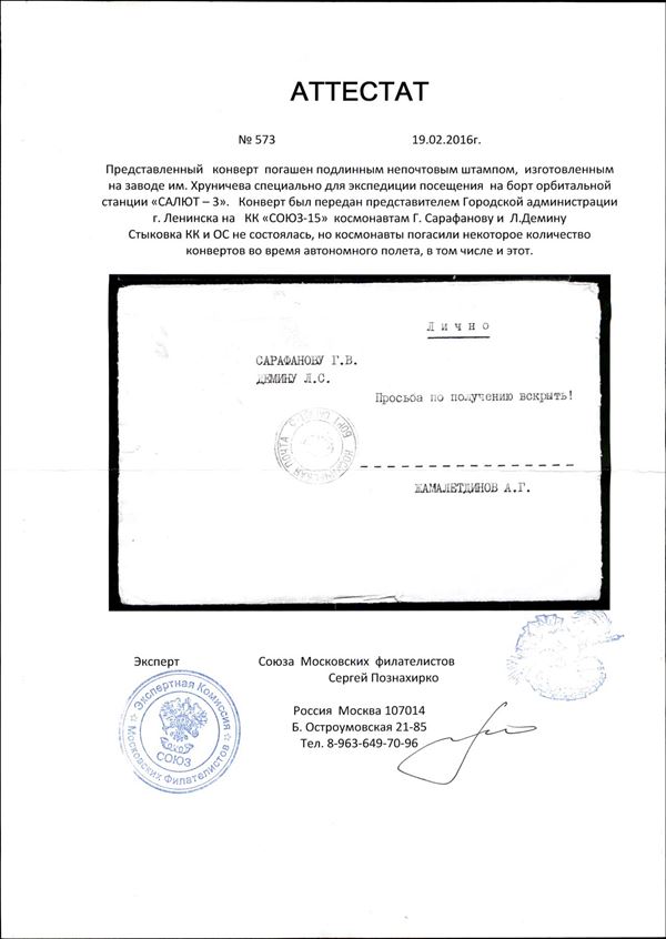 1974 - stazione orbitale Salyut-3 - Soyuz 15 - busta dattiloscritta con i nomi dei 2 cosmonauti G.Sarafanov e L.Dyomin, trasportata tra il 26-28.8.1974 dalla Soyuz 15 in orbita (a causa di un problema tecnico la navicella non riusć a realizzare l'aggancio) - nonostante l'incidente, raro timbro circolare "Posta cosmonautica/bordo Salyut-3 agosto 1974", il primo con dicitura di "posta spaziale" utilizzato a bordo di una stazione orbitale – rara e di buona qualità - cert. di autenticità russo del 2016