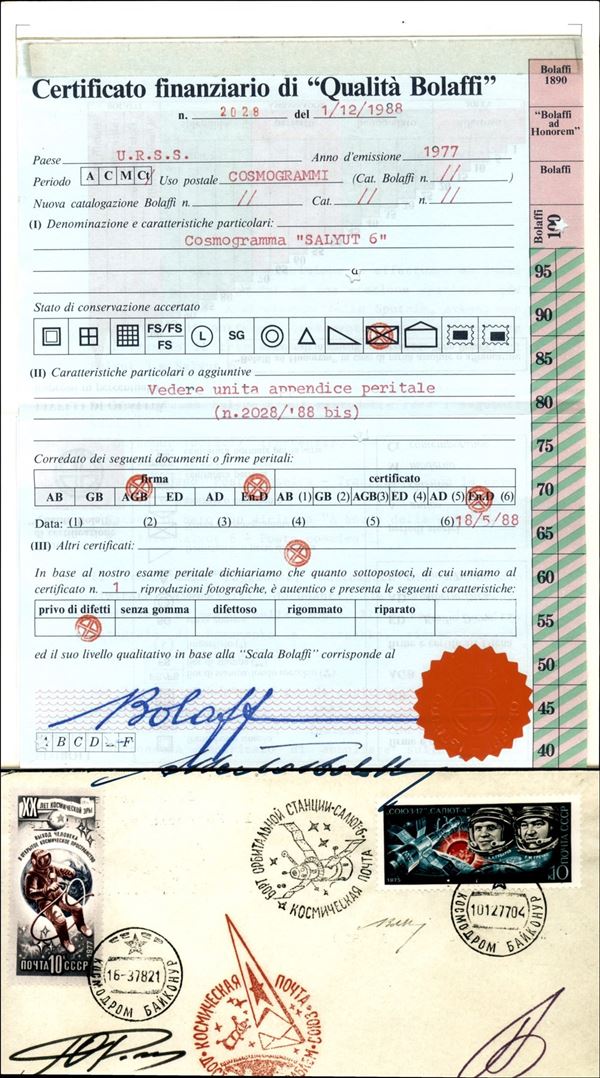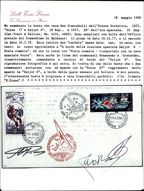 1977 - stazione orbitale Salyut-6 - cosmogramma del volo Soyuz 26 a bordo della Salyut-6 con firme autografe del comandante Y.Romanenko e e del tecnico di bordo G.Gretschko - annullo a data "CC*CP 10.12.77" e "CC*CP 16.3.78" apposti dall'ufficio postale del Cosmodromo di Baikonur (giorno di lancio della Soyuz 26 e di atterraggio con la Soyuz 27 dopo 96 giorni di permanenza sulla Salyut-6) - bollo nero "A bordo della stazione spaziale Salyut-6 Posta cosmica" e rosso "Posta cosmica - trasportato con la nave spaziale Soyuz" - la Soyuz 26 raggiunse con successo la stazione spaziale permettendo coś l' 11.1.1978, con l'arrivo della Soyuz 27, il primo aggancio di tre veicoli nel cosmo e la prima visita dell'equipaggio residente da parte di un equipaggio ospite (V.Dzhanibekov e O.Makarov - Soyuz 27) – ottima qualità – cert E.Diena + cert. Finanziario Bolaffi 100%
