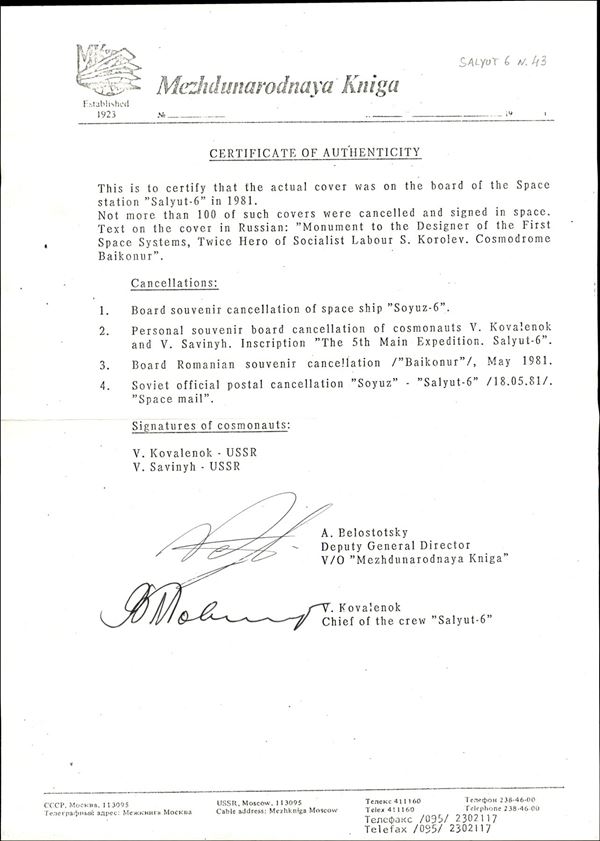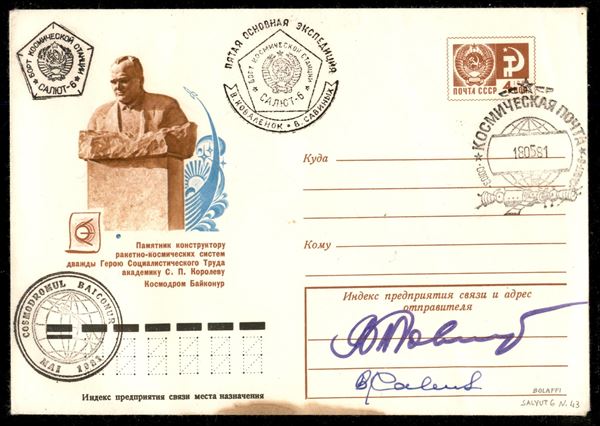 1981 - Soyuz 40 - vettore di ritorno Soyuz T4 - cosmogramma trasportato a bordo della navicella Soyuz 40, partita il 14.5.1981 e rientrata con il Soyuz T4 il 26.5.1981 - equipaggio Popov e Prunariu (Romani) - annullo pentagonale nero a bordo della stazione spaziale Salyut 6 + timbro commemorativo, timbro commemorativo e firme autografe dei cosmonauti Kovalenov e Savinykh con la scritta "La quinta principale spedizione, Salyut 6" con annullo ricordo rumeno del cosmodromo di Baikonur 18.5.1981 e annullo postale sovietico "Posta Spaziale" - cert. Kniga